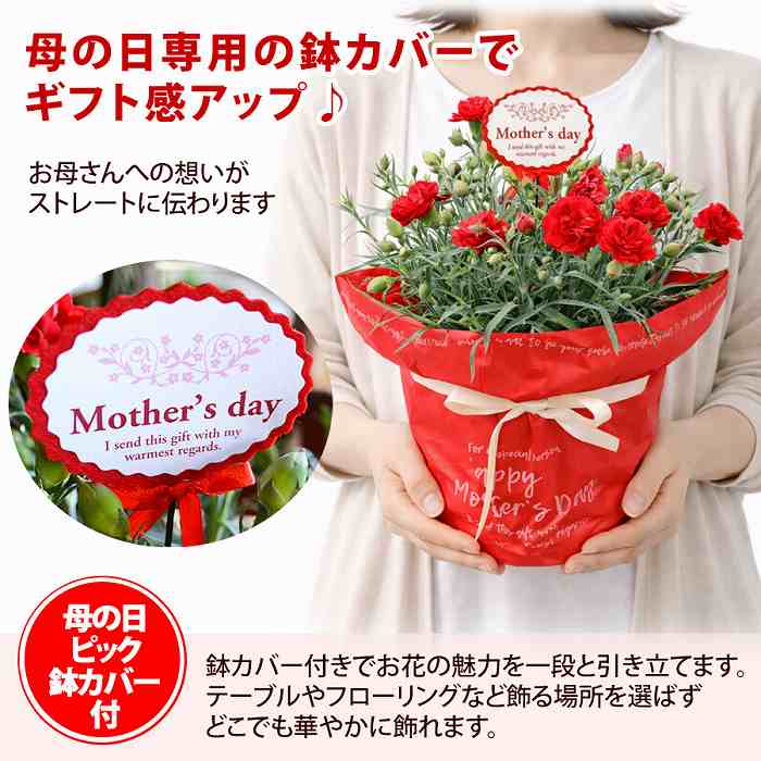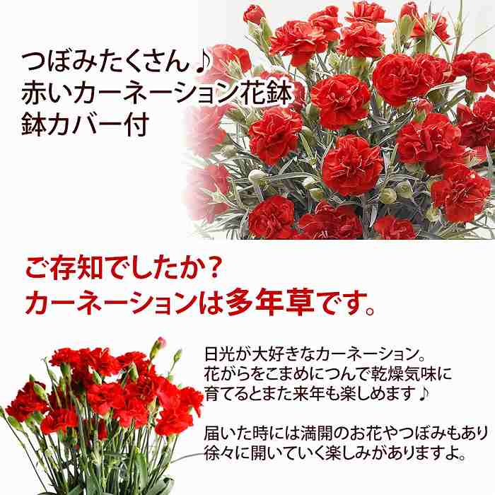 母の日といえば赤いカーネーション。鉢花のカーネーションはつぼみも多く次々と花が咲く様子を長く楽しめます。