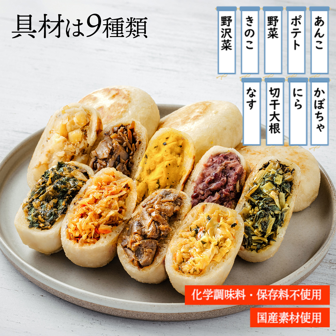 内容・容量 : 野沢菜、きのこ、やさい、ポテト、あんこ、なす、切干大根、にら、かぼちゃ各1ケ
